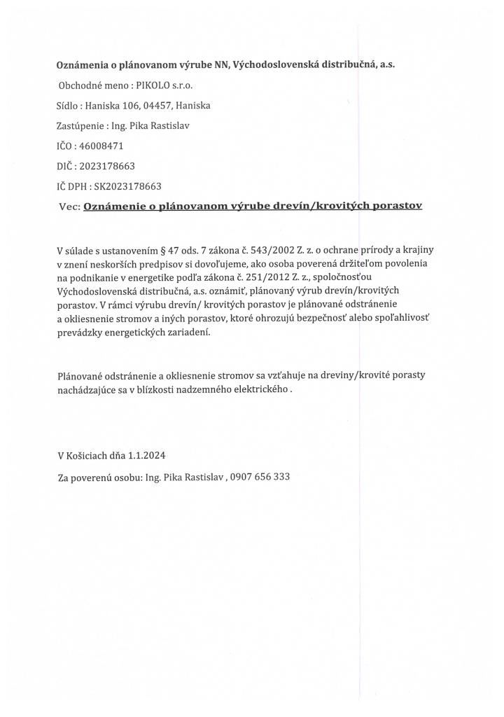 Oznámenie o plánovanom výrube drevín/krovitých porastov